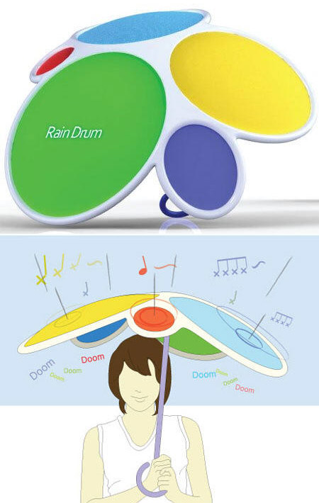 雨のしずくが傘に当たるたびに、ドラムが音を奏でます。とても楽しそうですが、場所を選ばないと周囲から雨よりも冷たい視線が突き刺さるかも知れません。