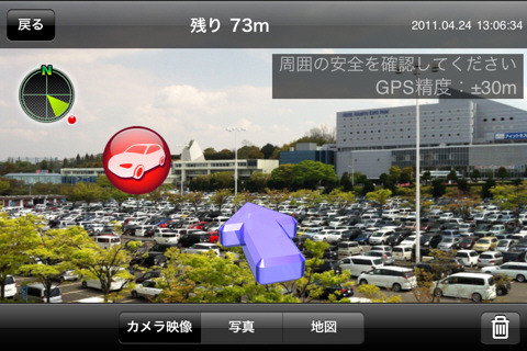 :降車時にiPhoneが自車位置を記憶し、クルマに戻る時に地図またはカメラ表示で駐車位置へと導いてくれます。ばかでかい駐車場のある遊園地やショッピングモールでむちゃくちゃ便利そう。