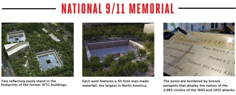 旧ワールドトレードセンター跡地には国立9.11記念碑・博物館が建設され、30フィート(9m)の人工の滝を含むプールがあります。銅板には2983名の犠牲者の名前が刻まれています。