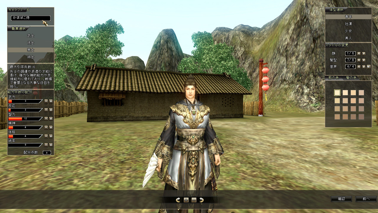 の4種類を選べます。このゲームは個人的に兵士を大量に率いて遊ぶのが楽しかったので、6人の兵を統率できる、策士にしてみました。