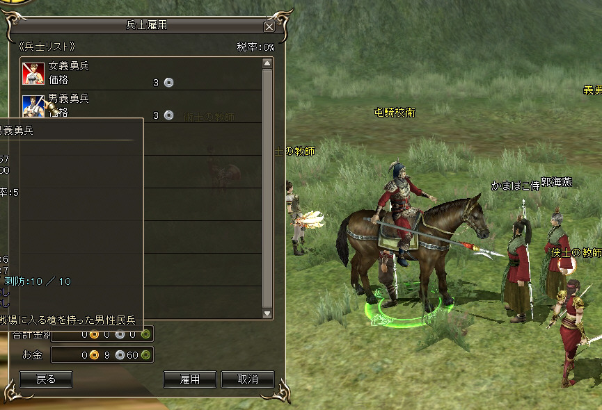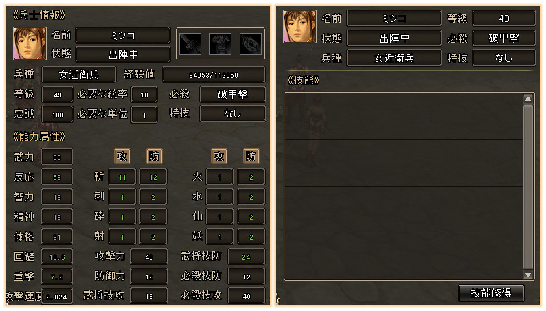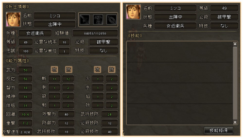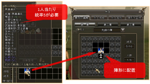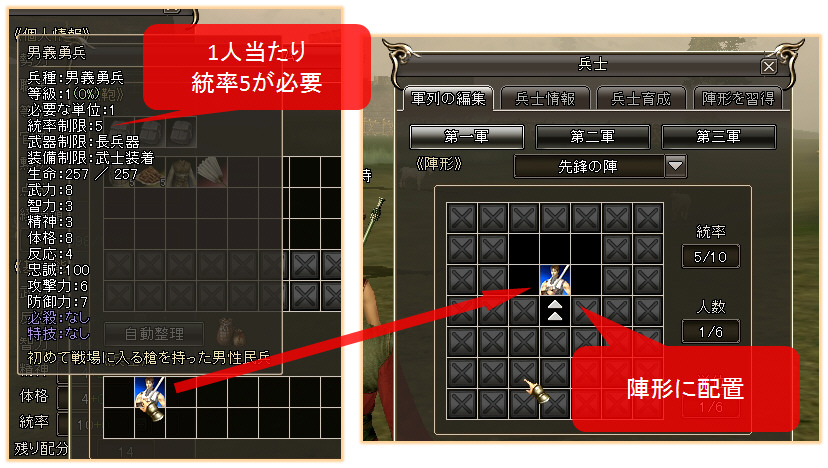 序盤で手に入る「男(女)義勇兵」の場合、1人あたり統率パラメーターが5必要なので、必要なだけ統率パラメーターを上げておきましょう。
