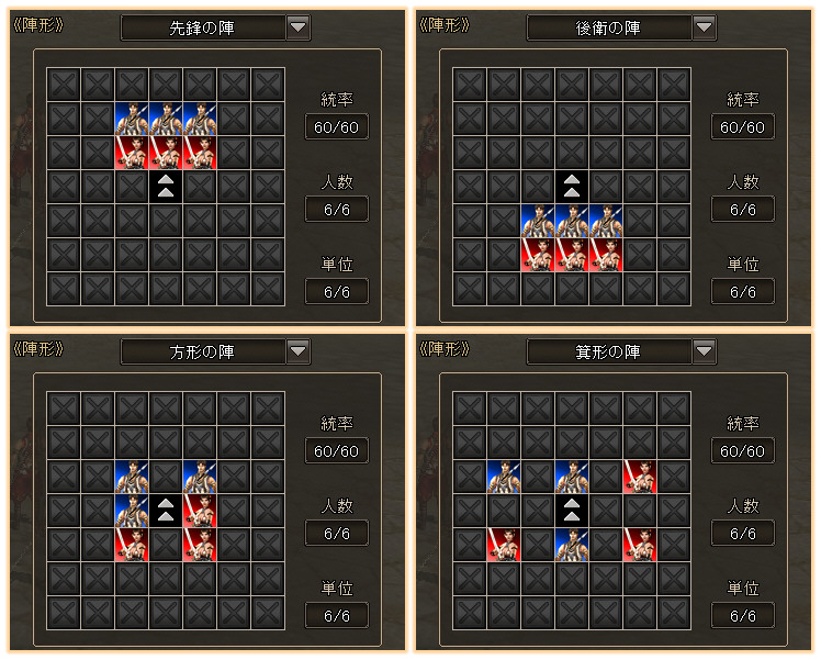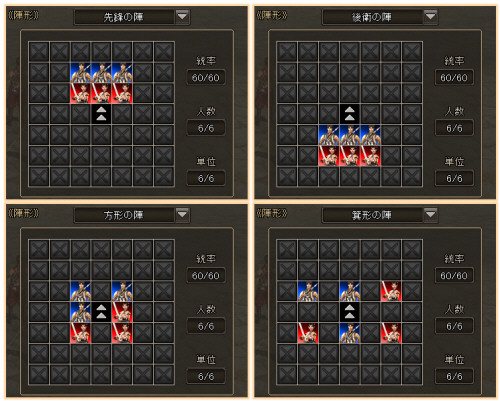 ちなみに兵士の陣形は、「先鋒の陣」「方形の陣」などいろいろ。戦略やユニットの組み合わせを細かく設定できます。