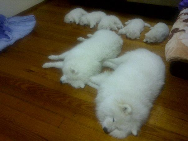 「家族全員、いっしょにおやすみ中」というサモエド犬の写真が、癒されると人気になっていましたのでご紹介します。
