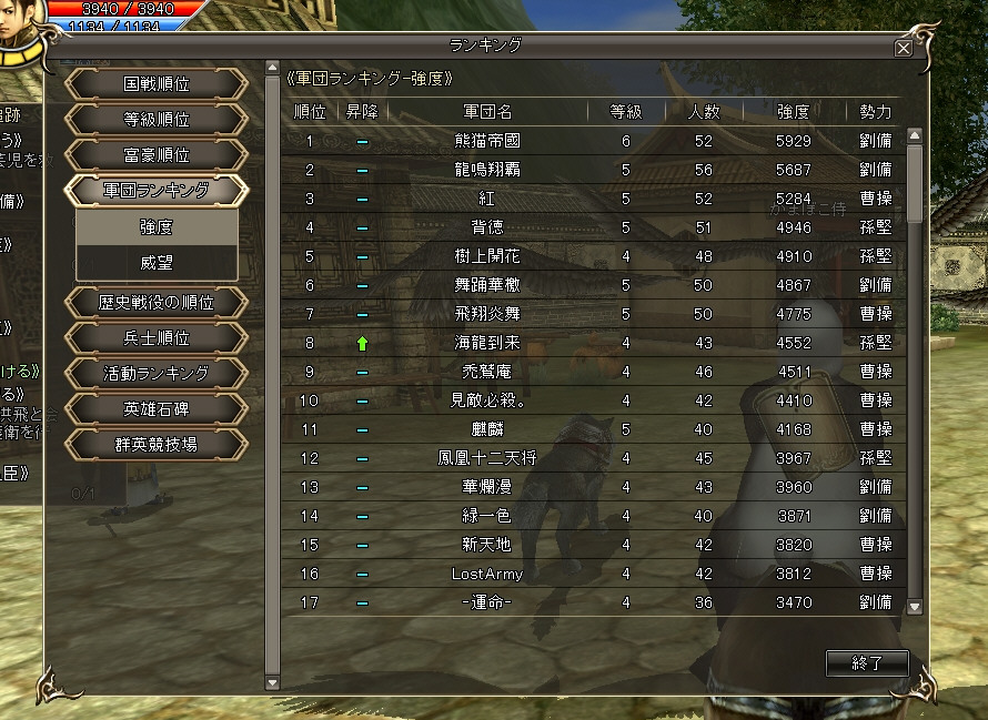 兵器に乗るには軍団(ギルド)に所属しないとダメなんだよ…と心優しい通りすがりの方に教わったので、軍団ランキングから恐る恐る入団申し込み。