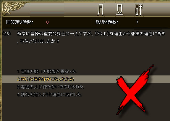 そう言えば前回気付かなかったんですが、このゲームでは定期的にアイテム収集や水上戦など色々なイベントを実施していました。これはそのイベントの一つである、三国志クイズイベント「月旦評」。って、