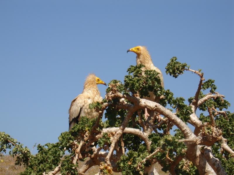 木に止まっているのは砂漠やサバンナに生息するエジプトハゲワシ。