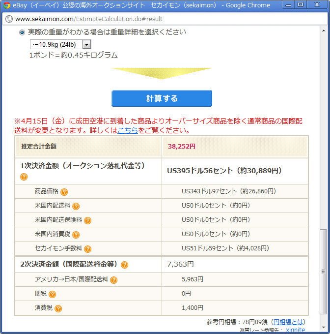 −−ここまで日本語になっていると、英語への抵抗感もかなり和らぎますね。購入時には表記された落札額の他に、手数料や送料も別途かかると思いますが、総額はどのくらいかかるのでしょうか。
