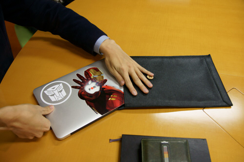 僕はこのMacbookAirのステッカーと、ケースですね。このケースは裏地がスウェードになっているんですよ。