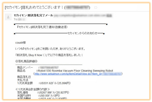 落札完了!しばらくすると落札通知のメールが届き、あとは待つだけ…って、こんなに簡単なの…!?