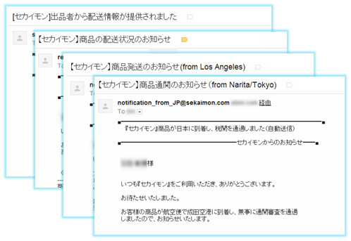 落札後、アメリカでの配送状況、日本への発送、通関の連絡が順次届き、落札から16日後…
