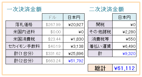 最終的な総額は、2台合計で61,112円。発送はタイミングが合って2台同梱発送されたため、少し割安になりました。ちなみに1台当たりの価格は、