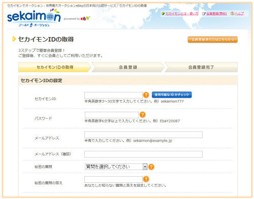 さてさて、まず最初にアカウントを作成します。ログインID、パスワード、メールアドレス、送り先の住所、決済方法(クレジットカードまたはPayPal)など、オークション参加に必要な情報を登録。