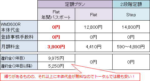 さて 本体の性能は素晴らしく良いのですが、気になるのは価格。調べてみたところ、1年縛りのFlat年間パスポートプランで新規加入すると、WM3600Rの本体代金17,800円が無料になるキャンペーンを現在行っているようです。