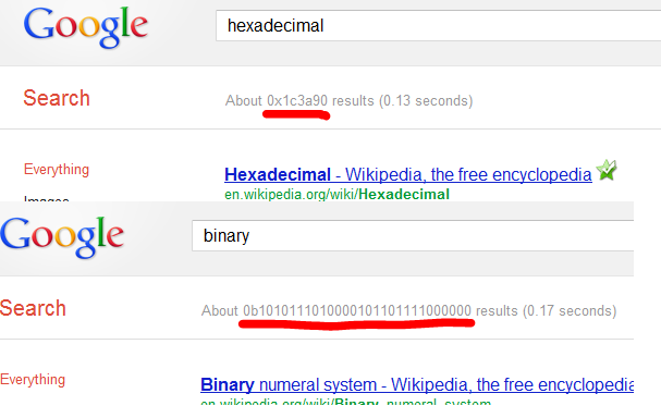検索結果の件数がそれぞれ十六進法と二進法の数字になっているのがわかるでしょうか。(十六進法は1〜9+アルファベット6文字、二進法は0と1で表記。)