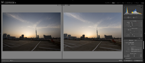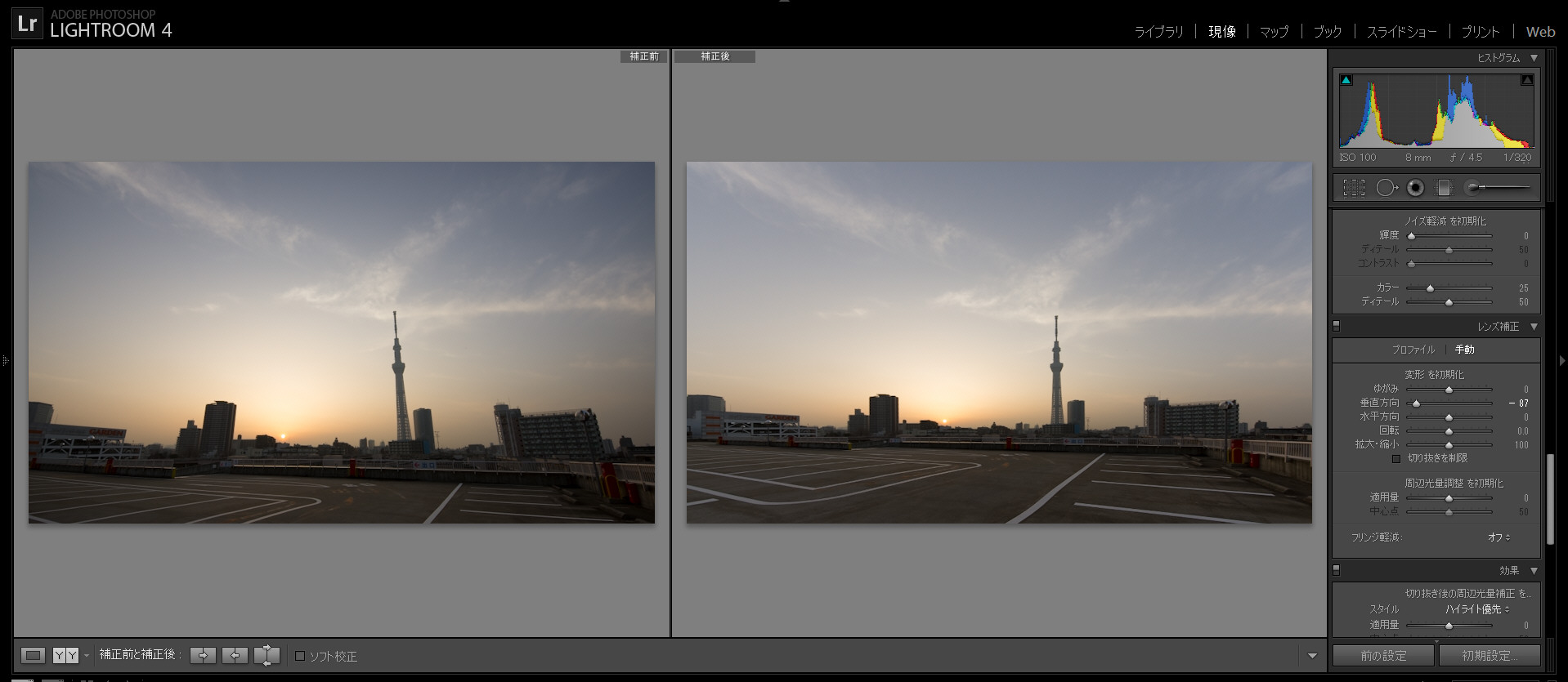 また、回転や拡大縮小で水平を合わせたり、水平・垂直方向に回転を加え、東京スカイツリーや周辺の建物が垂直になるよう調整も。試しに東京スカイツリーをまっすぐに直してみましたが、これだけでかなりプロっぽい印象に…。