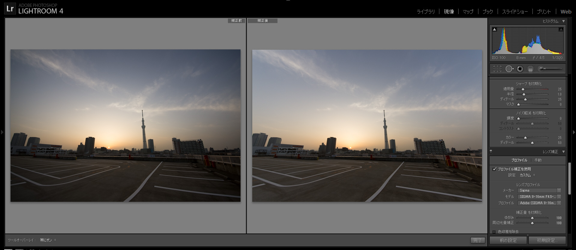 続いてレンズ補正。ちょっとわかりづらいかもしれませんが、レンズ特有の、歪みや外側に向かって暗くなる光量の減衰を修正、全体的に色むらや歪みがなくなり、スッキリとした仕上がりに。写真左上、右上の特に目立つ暗さがなくなりました。