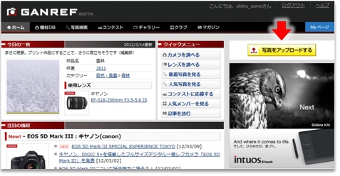 GANREFにメンバー登録してログインすると、トップページの右上に「写真をアップロードする」ボタンが表示されるので、ここから投稿します。