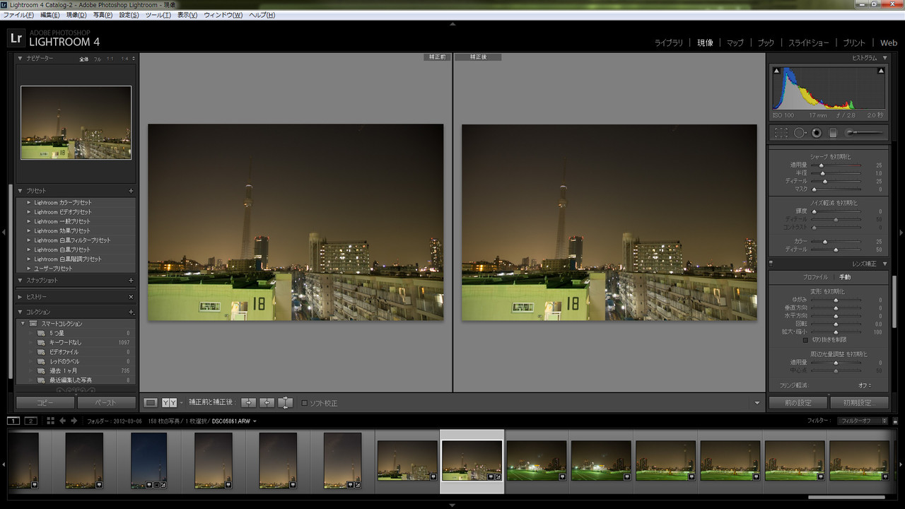 現像に使用するのは、PHOTOSHOP LIGHTROOM 4(体験版)。デジタル一眼レフのRAWデータの現像はもちろん、コンパクトデジカメや携帯で撮った写真も美しく仕上げられる現像ソフトです。