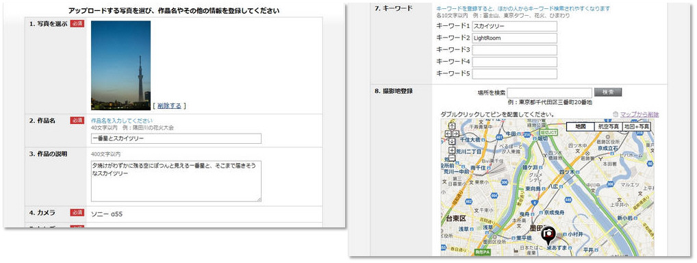 続いて投稿フォームで、必要事項や撮影地点を入力し、アップロードすれば完了!