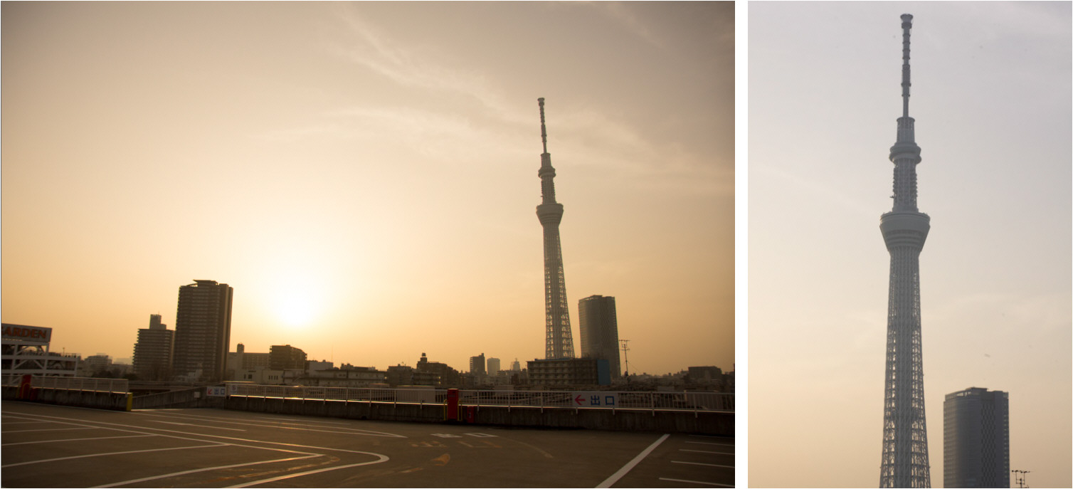 「ここはねー、立体駐車場になってるから、屋上に上がれば見上げずにスカイツリーが見えるんだよ!」