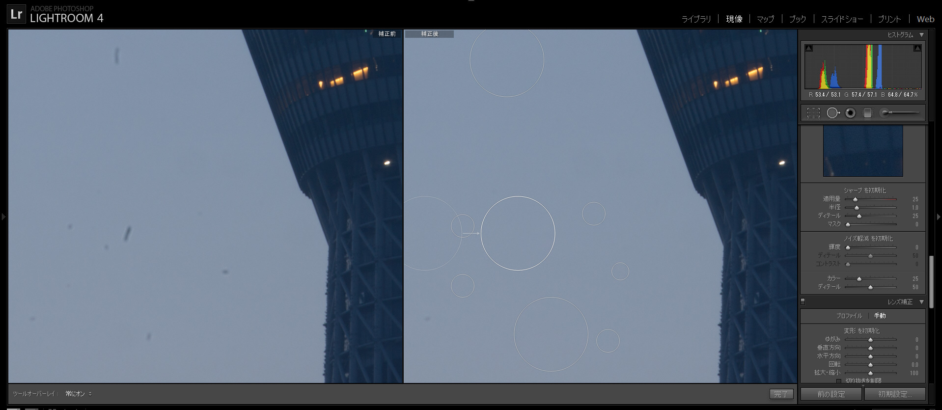 またうっかりレンズに付着したホコリが映ってしまった場合に便利なのが、スポット補正機能。消したいホコリを選ぶと、自動的に周囲から類似した部分を探して消してくれるのが便利。こういう機能は、カメラ純正の現像ツールにはまずありません。