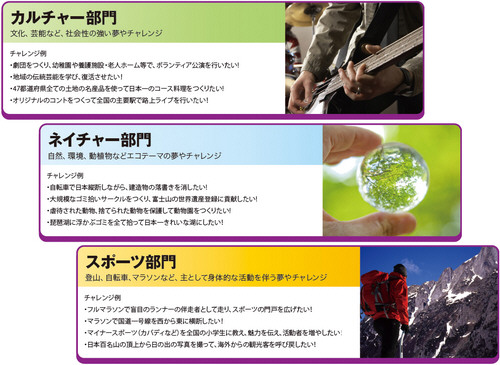 チャレンジのテーマは、カルチャー(文化・芸能)、ネイチャー(自然・環境)、スポーツの3部門。各部門ごとに
