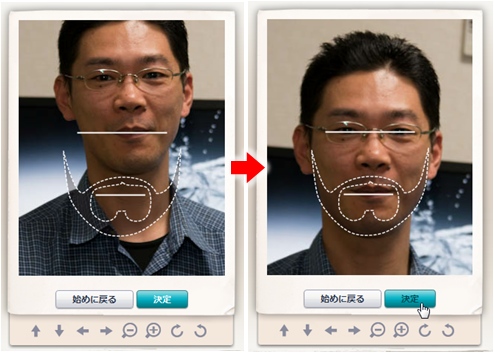 写真をアップロードしたら、ヒゲガイドに合わせて顔写真の位置を微調整。写真の拡大縮小、移動や回転など細かな調整ができるので、正面を向いている写真であれば大丈夫。