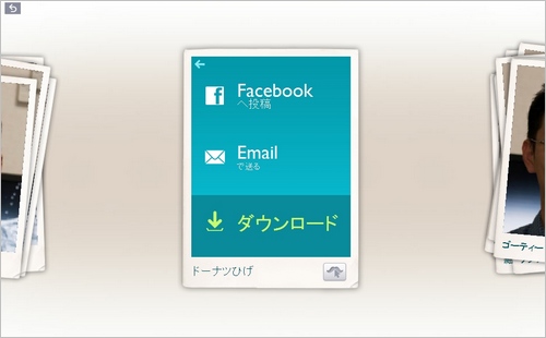 できあがった合成写真は、facebookへ投稿、Emailで送る、ダウンロードのいずれかの方法が選べます。コンテストに応募する場合は、ダウンロードを選びましょう。