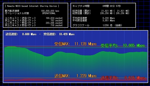 ダウンロード中、TCP Monitor Plusで通信速度を計測してみると、約11Mbpsをマーク。しばらく眺めていましたが、通信速度はかなり安定しています。