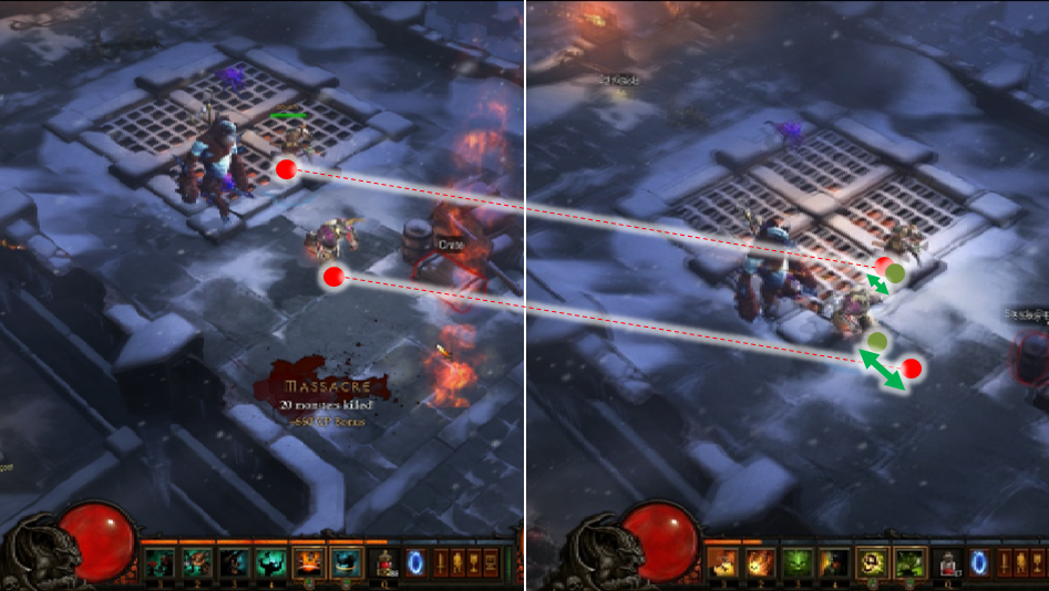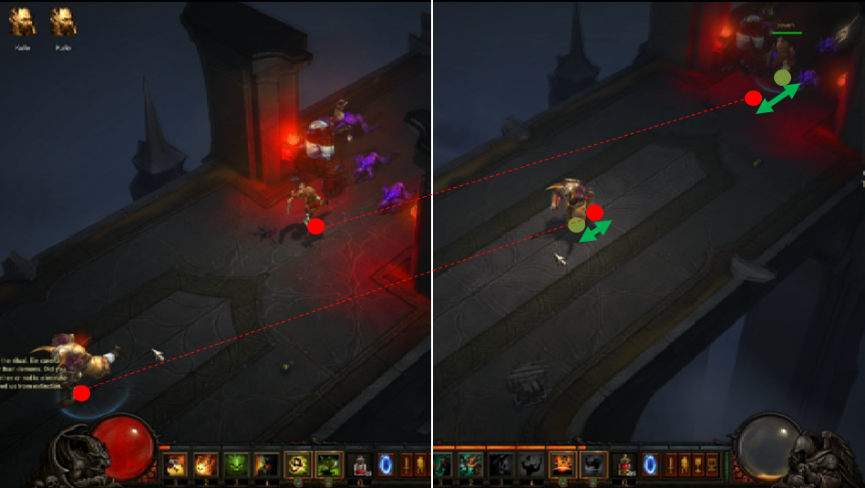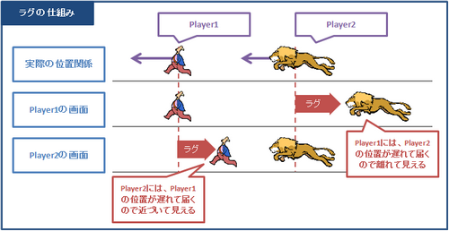 ラグがどういうものか簡単にまとめてみました。2人でオンラインプレイをした場合、それぞれのプレイヤーの画面には遅れて届いた相手プレイヤーの位置が表示されるため、遅れが大きいほど、お互いの画面に違いが出る事になります。