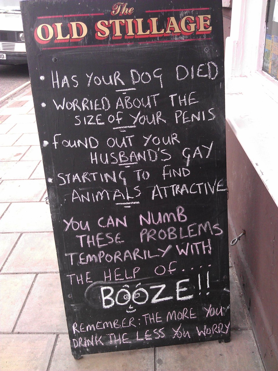「犬が亡くなったとか、男性自身のサイズにお悩みとか、夫がゲイであることを知ってしまったとか、動物たちが魅力的に見えるとか、そういった問題を一時的にお酒で緩和させましょう」