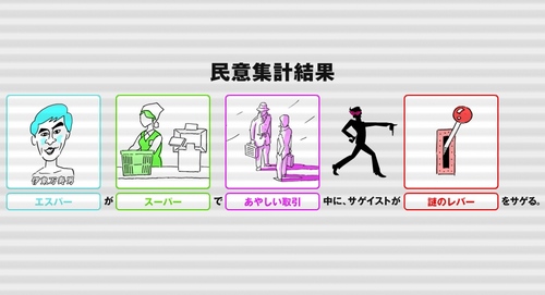 出演者に舞台、状況と演出の組み合わせで「 未だかつてない新時代のCMを!! 」となるはずのこの企画。もっとも票が集まった選択肢を組み合わせるという、性善説すぎる企画でしたが、実際に選ばれた選択肢は「 エスパー 」が「 スーパー 」で「 あやしい取引 」中に、サゲイストが「 謎のレバー 」をサゲる…ってそれどんな内容なのよ!?