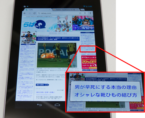 またAndroid4.1になり、ブラウザもChromeに進化。パソコンとほとんど同じタブブラウジングができるようになった上、縮小状態でゴチャッとリンクが集まった場所をタップすると、その部分だけ拡大してくれるなんていう便利機能も。出先でささっと調べものをする効率もかなり上がりました。