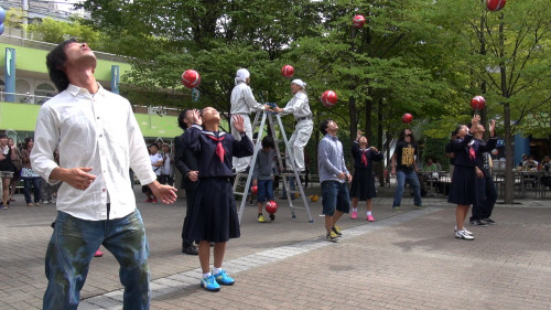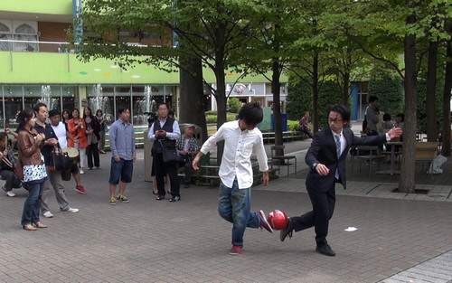 突然パーカッションのリズムが始まり、見事なリフティングを披露するビジネスマンとお兄さん。