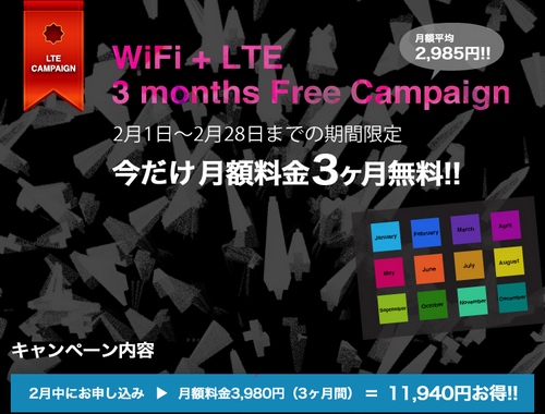 2月末までのキャンペーンを利用すれば、3ヶ月間の月額料金も無料に。