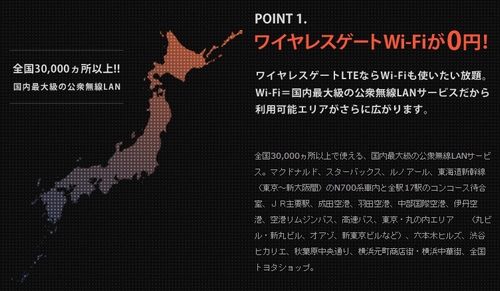 またWirelessGateの大きな強みが、利用できる公衆無線LANスポットの多さ。N700系東海道新幹線や、マクドナルド、スターバックスなどなど、全国3万カ所以上ものアクセスポイントが利用できます。もちろん、利用するのに追加料金は必要ありません。
