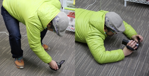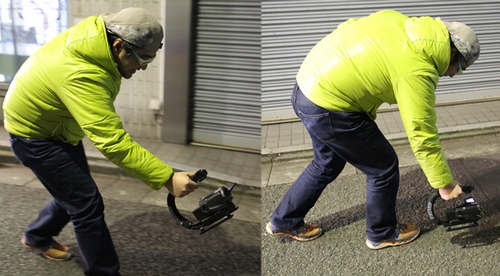 普通にローアングル撮影をしようとすると、こんなポジションに。これじゃ腰が痛くなっちゃうし、右は満足に動けないどころか服が汚れちゃいますよね。