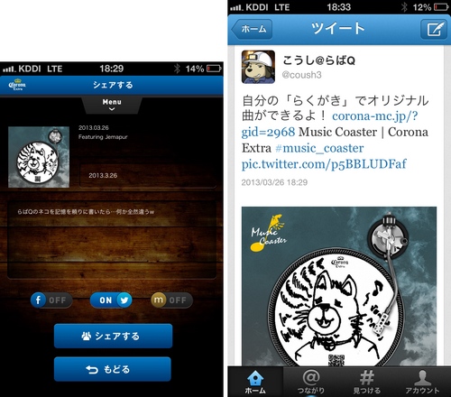 また出来上がったらくがきと音楽は、Twitterやfacebook、mixiでシェアすることも。曲を聞くだけならアプリが不要なのも手軽でいいですね。