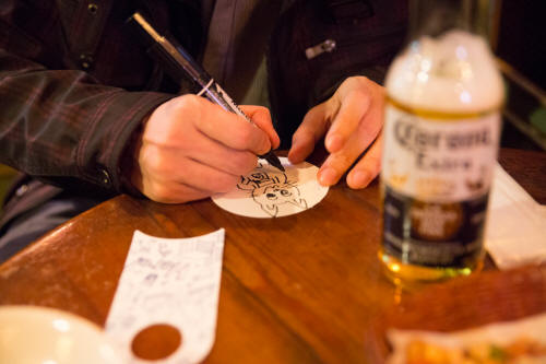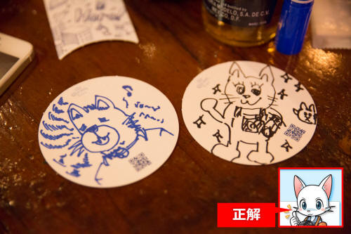 コロナビールを注文すると、一緒出てきたコースター。裏面の白い部分に、好きに絵を描きます。