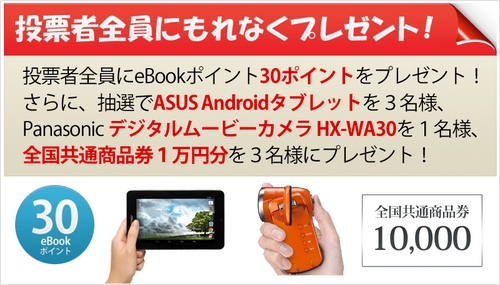 また抽選で ASUSのAndroidタブレット や パナソニックのデジタルムービーカメラ 、 全国共通商品券 1万円分が当たるプレゼントも。これは投票しておかないと…!