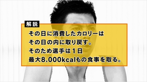 実際には、一食で8,000kcalを取るのは内臓への負担も大きく吸収しづらいため、選手は1日中こまめに何かを食べているのだそうですよ。