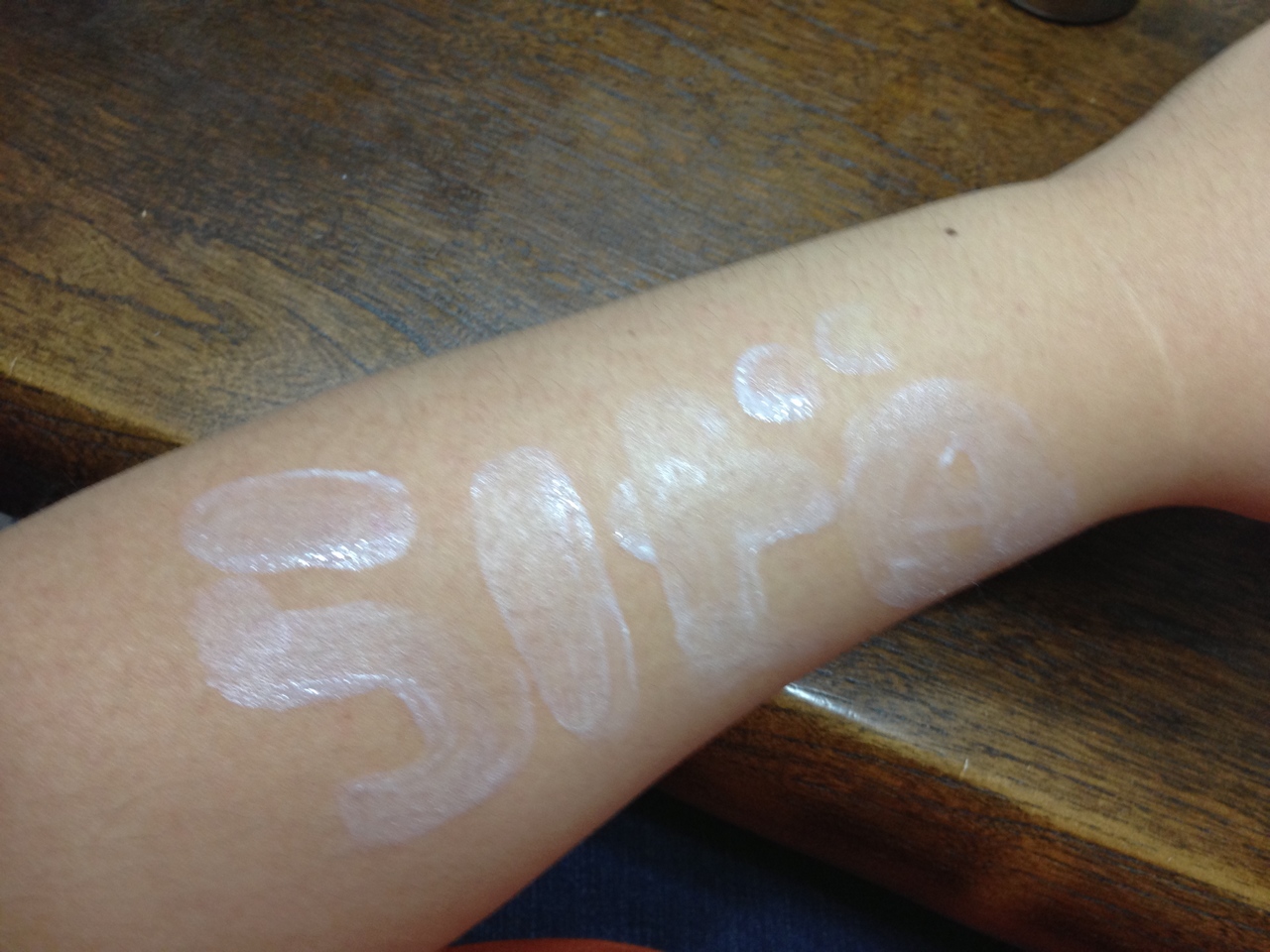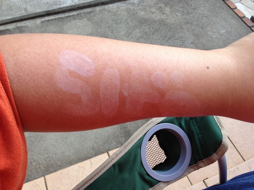 紫外線の影響を見るために、SPF50のクリームで腕に「らばQ」と書いてみました。