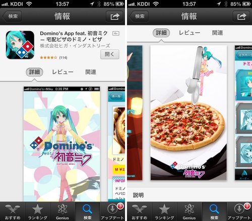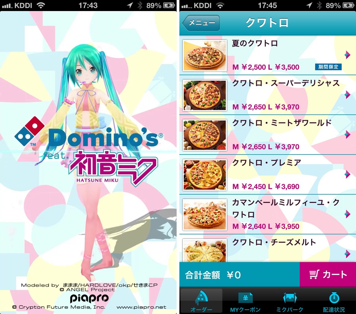 初音ミク」は、ドミノ・ピザのオーダーができる無料のiPhone用アプリの初音ミクバージョン。7月中旬にアプリがアップデートされ、衣装が夏バージョンに変化しました。