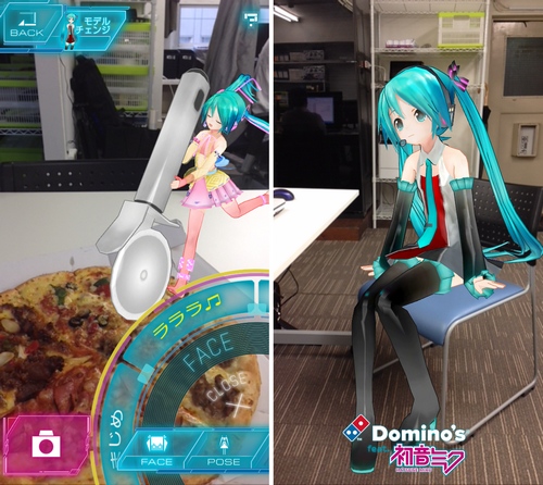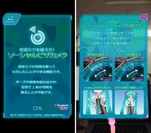 「ソーシャルピザカメラ」は、実写と初音ミクを重ねて撮影できるアプリなのですが、なんと初音ミクは3Dモデルで、移動や回転、拡大縮小はもちろん、ポーズや表情、衣装の変更も可能に。