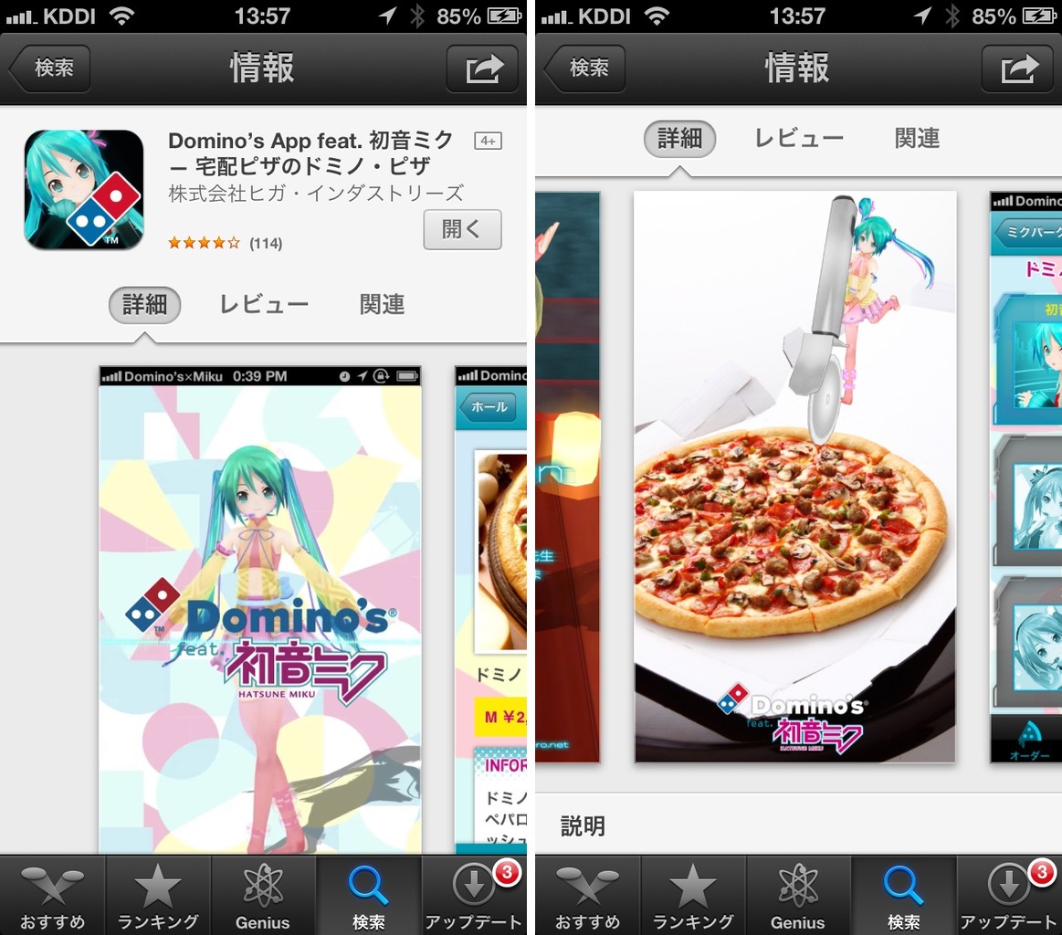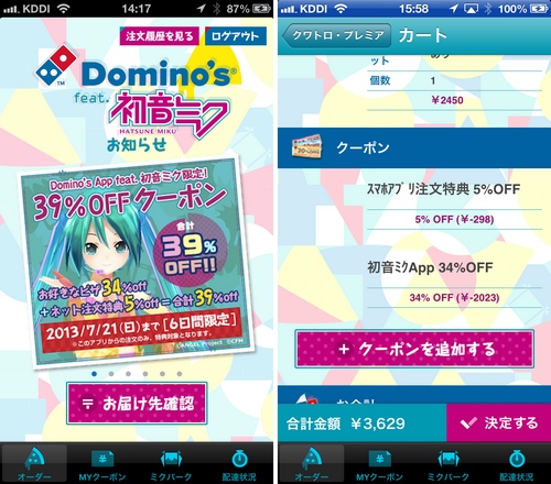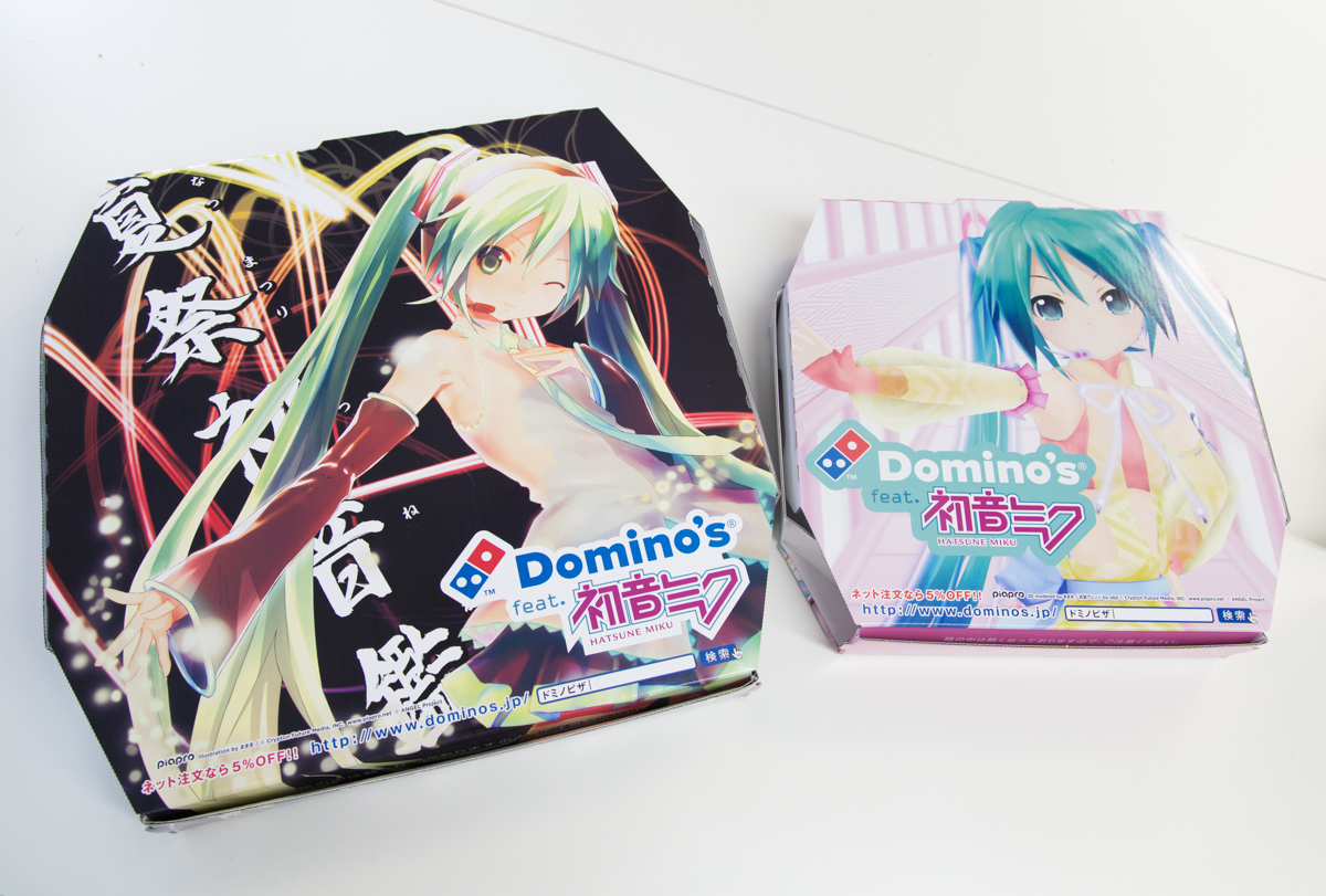 ドミノ・ピザの初音ミクバージョンのiPhoneアプリ「 Domino's App feat. 初音ミク 」の夏バージョンがリリースされ、特製の初音ミクBOXでの配達、さらにこのアプリから注文すると39%(ミク)オフになる期間限定クーポンも発行されています。
