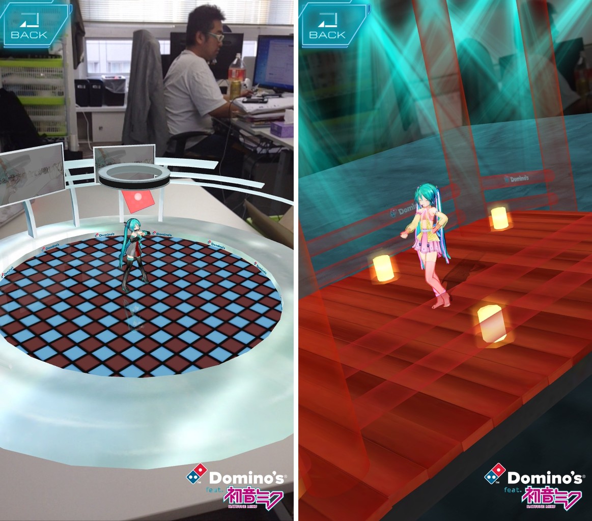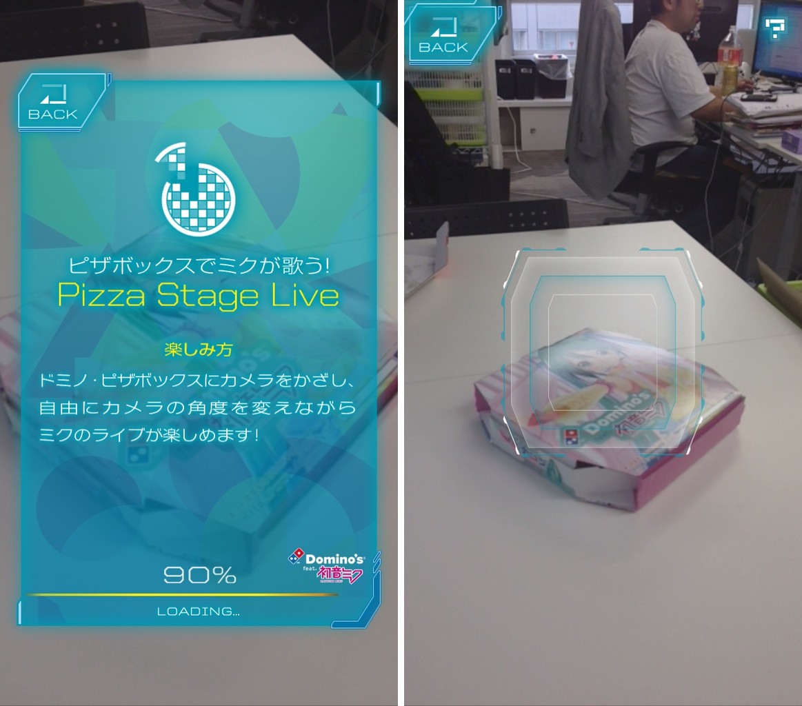 ドミノ・ピザの箱がステージに…!いわゆるARというものですが、現実世界にライブステージがあるみたいでスゲエェェ!!