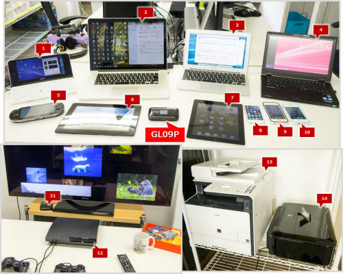 ちなみにこの機種は、最大で14台同時に接続できるのも特徴の一つ。そこで、編集部中の実際に仕事に使っているWi-Fi対応機器を目一杯接続してみました。
