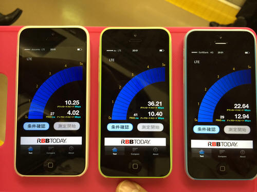今回の検証では、ドコモ、au、ソフトバンクのiPhone 5cにて通信速度計測アプリ「RBB TODAY SPEED