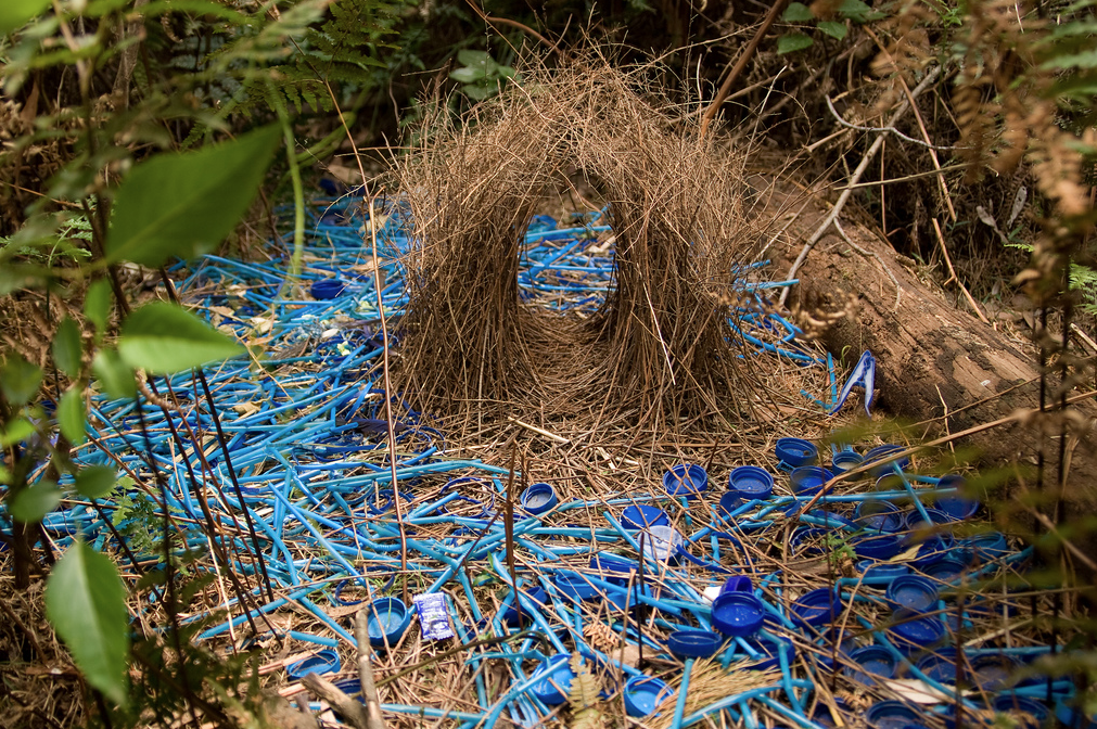 ちなみにこちらがメスが気に入ってくれたところ。鮮やかな青色を好むことが多いそうで、このニワシドリのオスは青い鳥の羽を集めたようです。