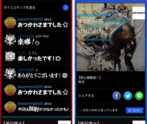 あっという間に秋水をクリアしてしまい、共闘ギルドを使って挨拶と反省会。